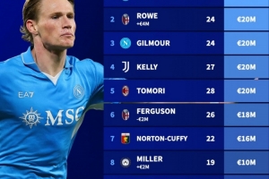 1、麦克托米奈(那不勒斯,29岁):4500万欧