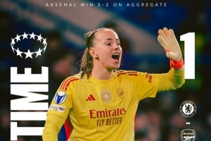 女足欧冠1/4决赛首回合比赛,阿森纳女足主场3-1战胜切尔西女足,次回合切尔西女足凭借尼斯肯在补时阶段的进球1-0取胜,但阿森纳女足仍以3-2的总比分晋级半决赛。
